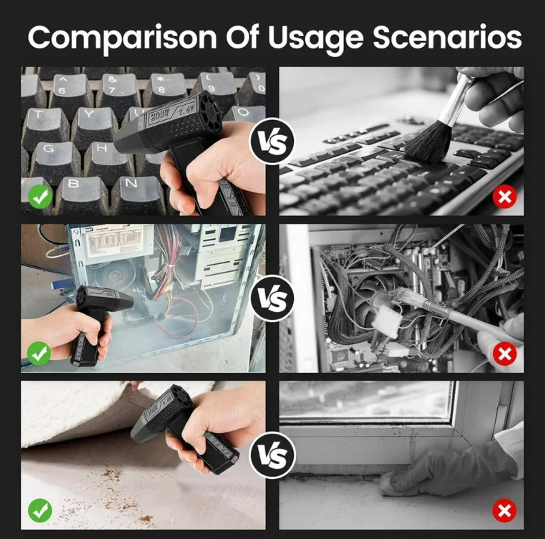 8. Usage: Air cushion blowing and suction, computer equipment cleaning, industrial dust blowing, charcoal burning to support combustion, car blowing and snow blowing, film studio shooting and wind making, drying pets, and many other uses
